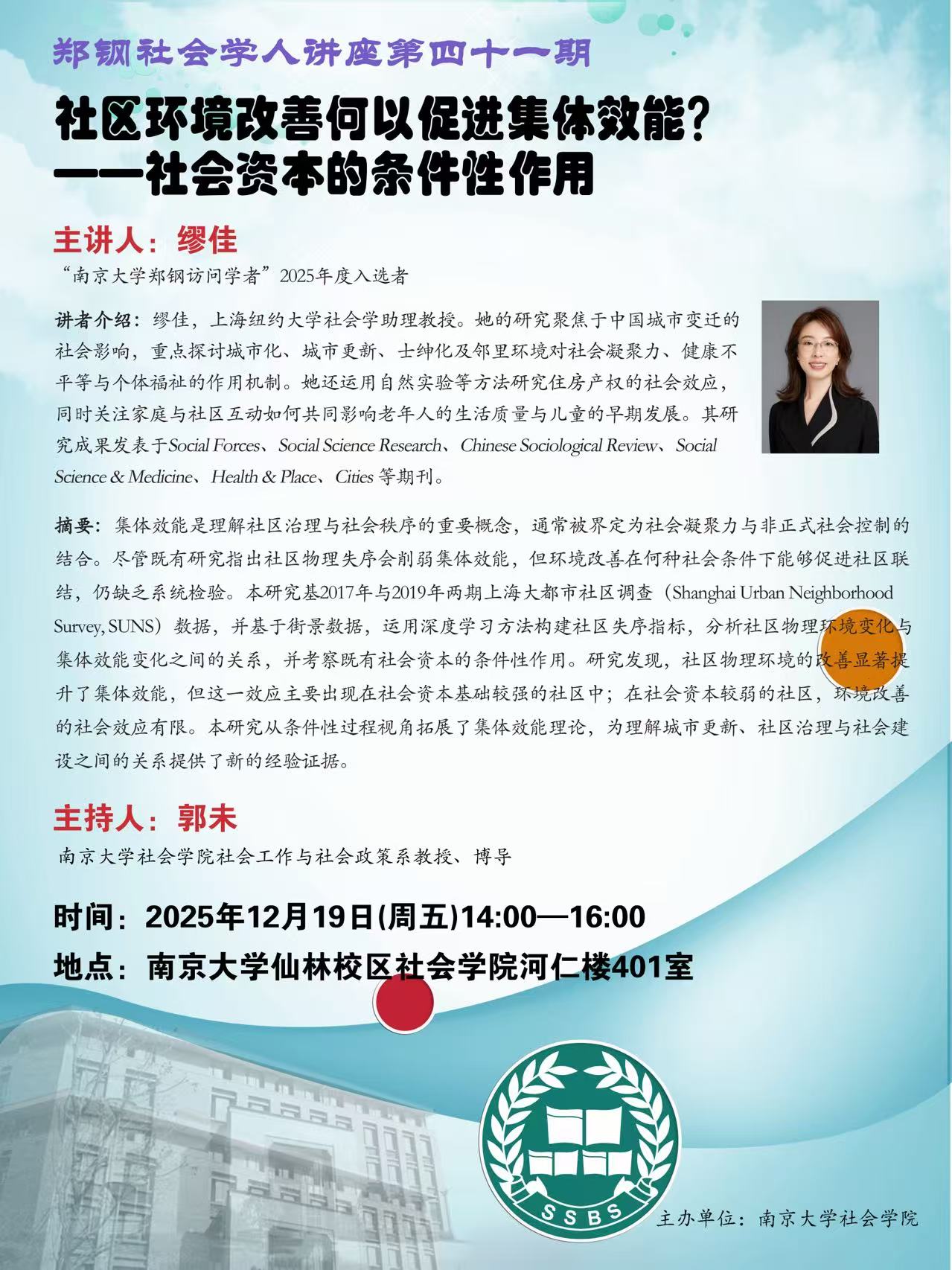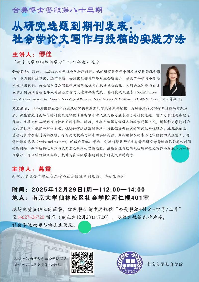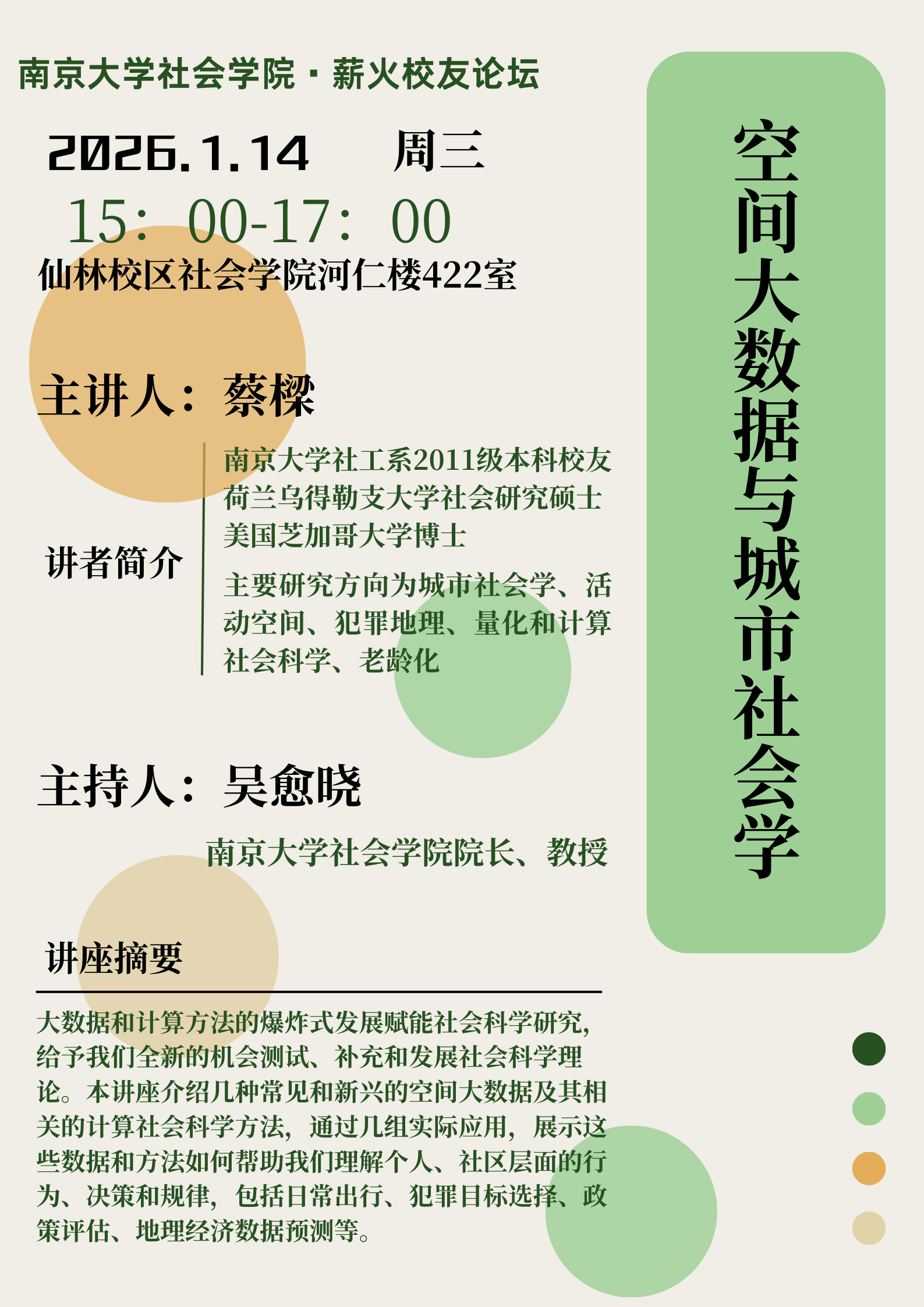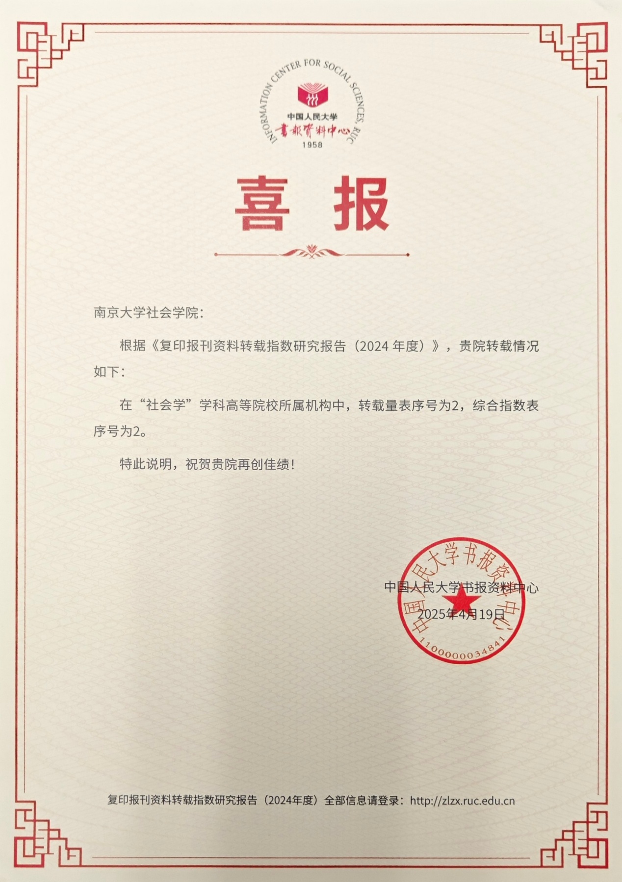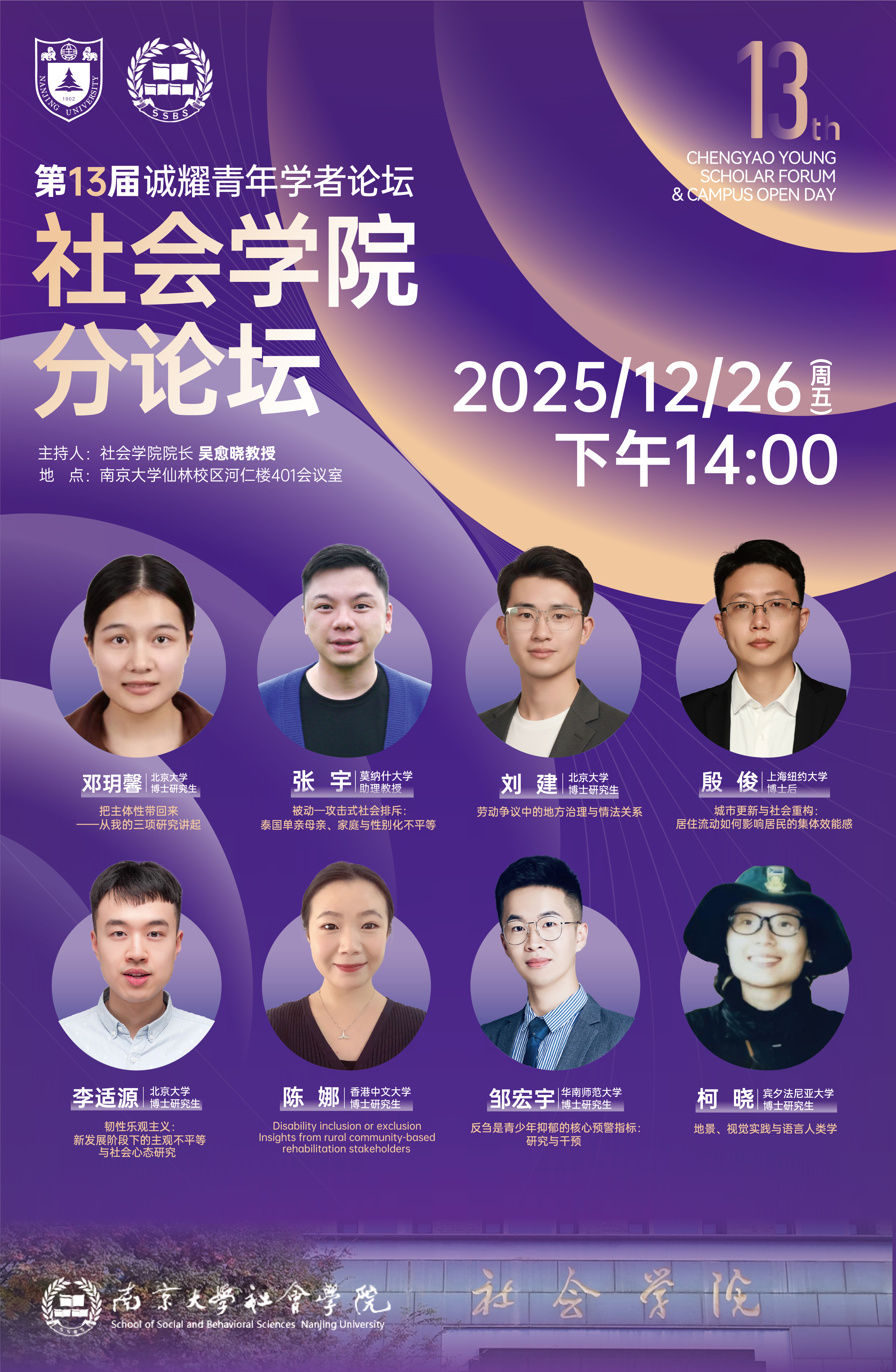 20252008南京大学社会学院关于调整硕士研究生招生专业目录的公告自2026级起,社会学院硕士研究生招生目录中,原基础心理学、应用心理学调整为社会心理学(0303Z1);原人口学调整为社会学(030301)研究方向之一,具体如下:专业代码、名称及研究方向考试科目备注030301 社会学本专业为国家重点学科。01 (全日制)社会学理论与方法02 (全日制)应用社会学03 (全日制)社会治理与社会政策04 (全日制)社会工作05 (全日制)社会心理06 (全日制)人口学①101 思想政治理论②201 英语(一) 或 203 日语③614 社会学理论④837 社会学方法030303 人类学01 (全日制)社会文化变迁02 (全日制)经济和政治人类学①101 思想政治理论②201 英语(一) 或 203 日语③614 社会学理论④876 民族志经典0303Z1 社会心理学01 (全日制)认知心理学02 (全日制)社会认知神经科学03 (全日制)社会心理学04 (全日制)临床与咨询心理05 (全日制)人的社会行为障碍的评估、诊断和矫正06 (全日制)认知调控与情绪调节07 (全日制)人力资源开发与管理08 (全日制)用户体验与人类工效09 (全日制)社会心态与