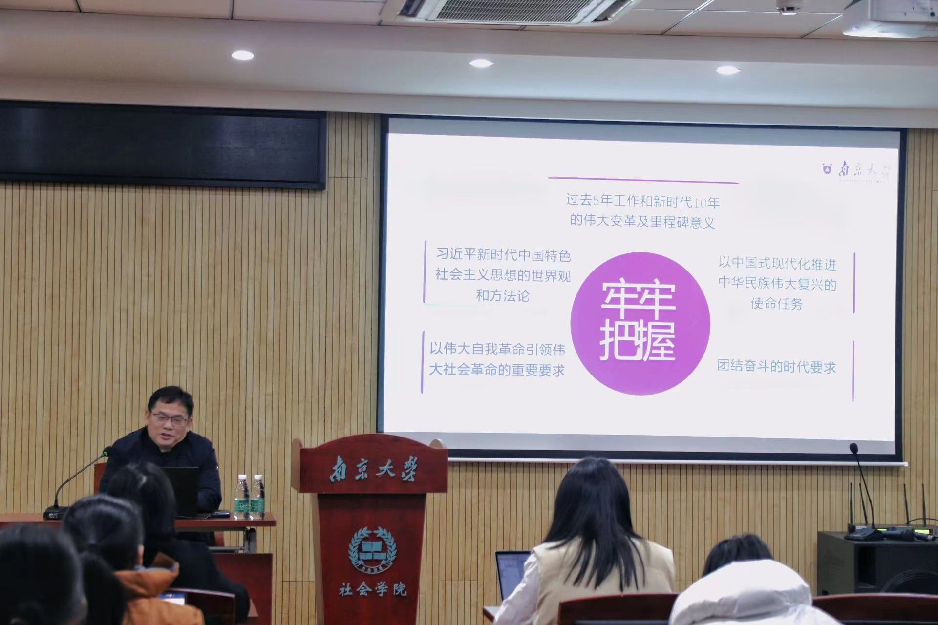 为深入学习宣传贯彻党的二十大精神和习近平新时代中国特色社会主义思想,全面落实习近平总书记给我校留学归国青年学者的重要回信精神,凝聚共识、汇聚力量,助推加快建设"第一个南大",12月7日下午,天宫直播 党委在河仁楼101报告厅开展以“夺取新胜利的政治宣言和行动纲领”为题的主题党课。此次党课为天宫直播 党委“全面贯彻二十大精神 加快建设‘第一个南大’”大讨论系列活动之一,由天宫直播 马克思主义学院副院长、教授、研究生导师陈建教授主讲,天宫直播 全体师生党员共同参与学习。