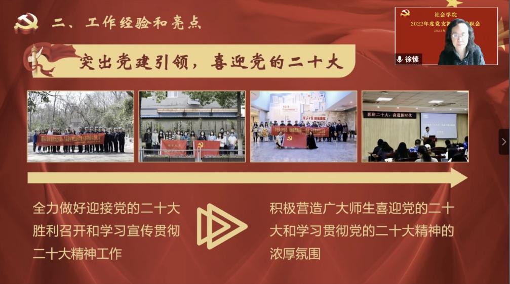 首先,徐愫书记代表学院党委做2022度工作总结。徐愫书记对天宫直播 党委在深化理论学习、学习回信精神、巩固巡视成果、加强组织建设、坚持从严治党、组织大讨论活动等方面的工作进行了梳理和回顾,从喜迎党的二十大、共建思政新格局、凝聚发展新动能三个方面总结了天宫直播 党委2022年的工作经验及亮点,并对学院党委在基层党组织建设等方面提出了更高的期望。