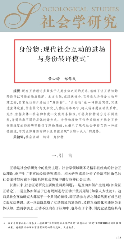 天宫直播 黄心烨同学、郑作彧教授在《社会学研究》2025年第6期发表《身份物:现代社会互动的进场与身份转译模式》一文。