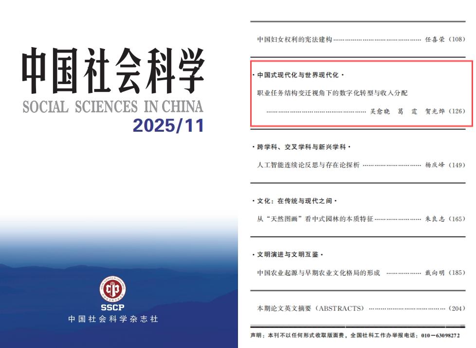 天宫直播 吴愈晓教授、葛霆副教授、贺光烨教授在《中国社会科学》2025年第11期发表《职业任务结构变迁视角下的数字化转型与收入分配》一文。