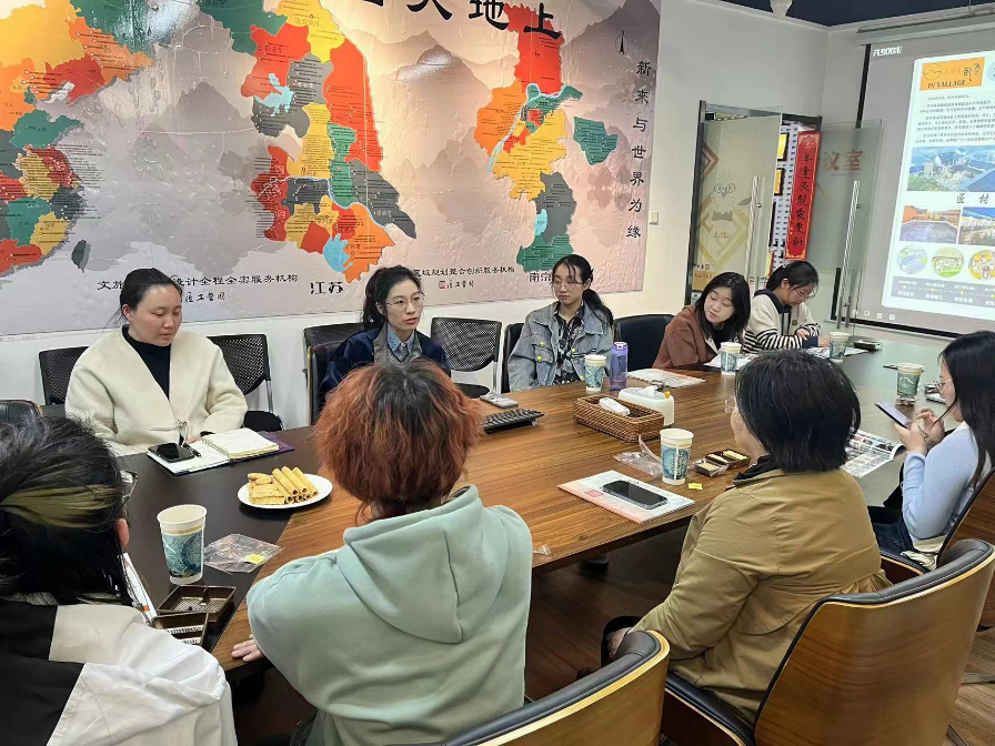接着,师生们一行抵达江苏匠工营国规划设计有限公司。此次活动中,2005级社会工作专业校友、公司负责人之一的吴俣女士热情接待了大家。她以“匠,巧也。渊图远算,不世之略”为引,详细介绍了公司的组织架构、经营理念和业务范围。吴俣女士表示,匠工营国始终秉持“用生命赞美城市”的核心价值观,立志成为城乡规划与设计、文旅规划与设计以及产业与区域规划等领域的集成服务机构和创新引领者。她通过图文并茂的方式,为大家展示了公司曾策划的多个标杆项目,如江苏高淳桠溪“国际慢城”、洪泽县老山子镇龟山村传统村落以及盐城市九龙口沙庄古村(淮剧小镇)等,这些项目不仅业界认可度高,也赢得了社会各界的广泛赞誉。