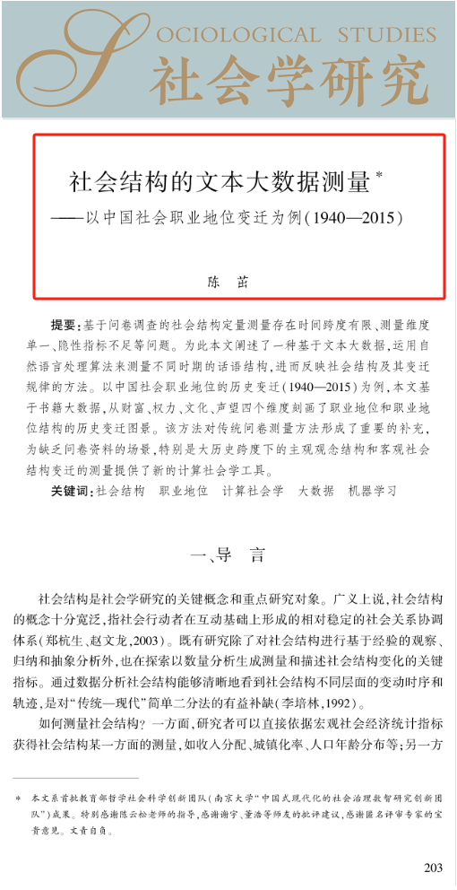 天宫直播 陈茁助理研究员在《社会学研究》2025年第2期发表《社会结构的文本大数据测量——以中国社会职业地位变迁为例(1940—2015)》一文。
