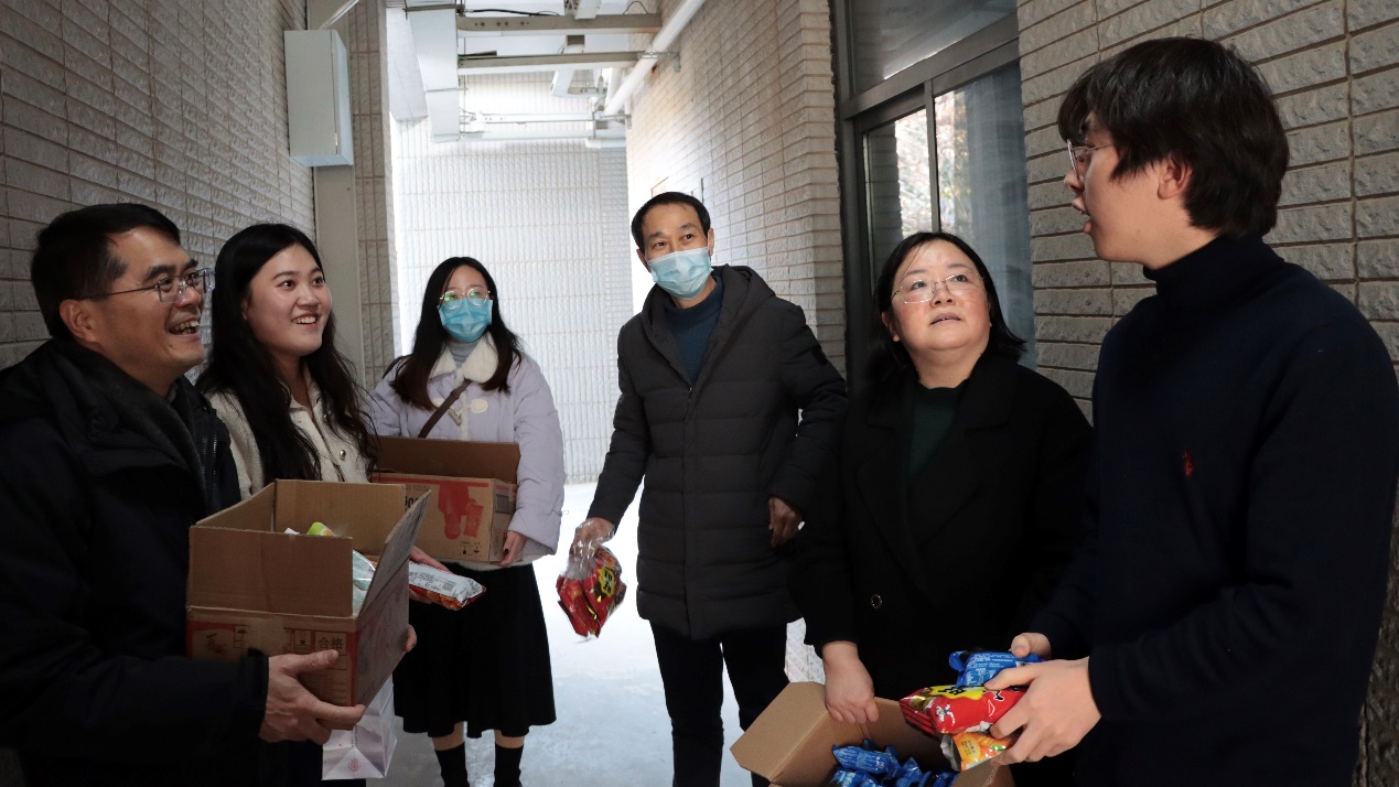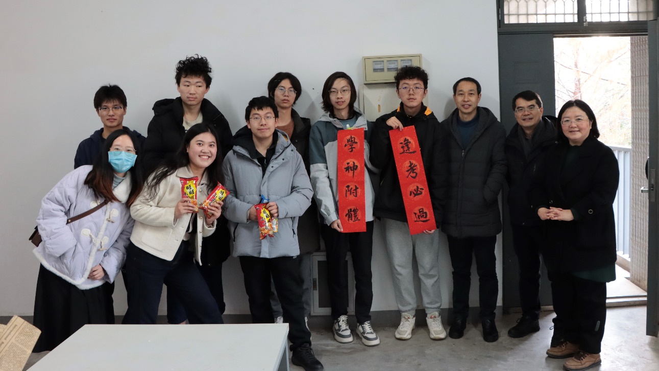 从学生中来,到学生中去。为加强师生联系,关心学生学习生活,天宫直播 党委书记王建富、党委副书记沈晖、副院长吴愈晓、本科生辅导员刘艺、研究生辅导员邵晓宁于1月5日下午走进仙林校区本科生宿舍,为同学们送上了贴心的备考礼包和暖心的祝福。