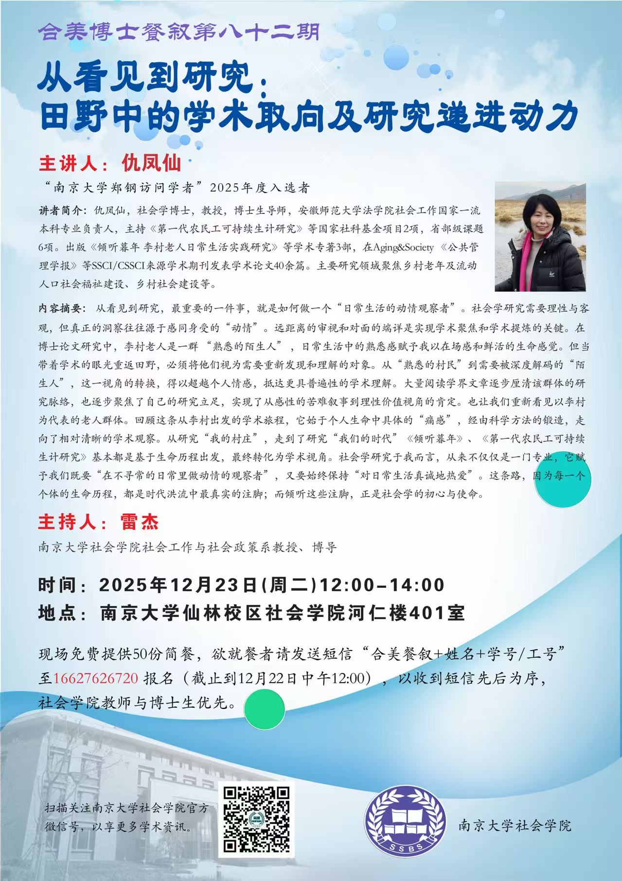 20252008南京大学社会学院关于调整硕士研究生招生专业目录的公告自2026级起,社会学院硕士研究生招生目录中,原基础心理学、应用心理学调整为社会心理学(0303Z1);原人口学调整为社会学(030301)研究方向之一,具体如下:专业代码、名称及研究方向考试科目备注030301 社会学本专业为国家重点学科。01 (全日制)社会学理论与方法02 (全日制)应用社会学03 (全日制)社会治理与社会政策04 (全日制)社会工作05 (全日制)社会心理06 (全日制)人口学①101 思想政治理论②201 英语(一) 或 203 日语③614 社会学理论④837 社会学方法030303 人类学01 (全日制)社会文化变迁02 (全日制)经济和政治人类学①101 思想政治理论②201 英语(一) 或 203 日语③614 社会学理论④876 民族志经典0303Z1 社会心理学01 (全日制)认知心理学02 (全日制)社会认知神经科学03 (全日制)社会心理学04 (全日制)临床与咨询心理05 (全日制)人的社会行为障碍的评估、诊断和矫正06 (全日制)认知调控与情绪调节07 (全日制)人力资源开发与管理08 (全日制)用户体验与人类工效09 (全日制)社会心态与